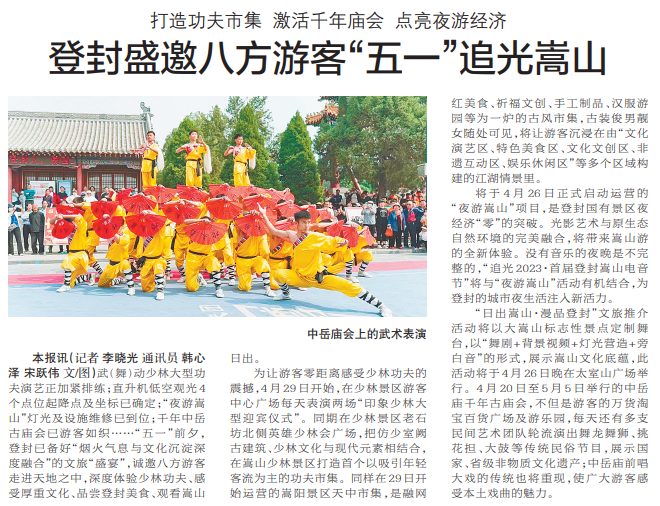 武(舞)动少林大型功夫演艺正加紧排练;直升机低空观光4个点位起降点及坐标已确定;“夜游嵩山”灯光及设施维修已到位;千年中岳古庙会已游客如织……“五一”前夕,登封已备好“烟火气息与文化沉淀深度融合”的文旅“盛宴”,诚邀八方游客走进天地之中,深度体验少林功夫、感受厚重文化、品尝登封美食、观看嵩山日出。(今日《郑州日报》5版)