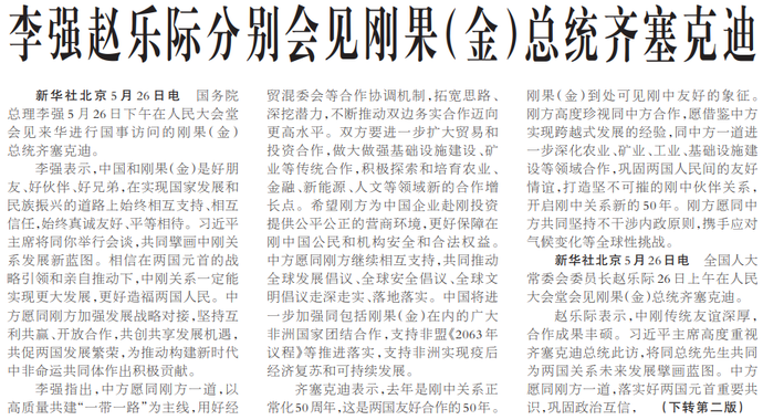 国务院总理李强5月26日下午在人民大会堂会见来华进行国事访问的刚果(金)总统齐塞克迪。(今日《人民日报》1版、2版)