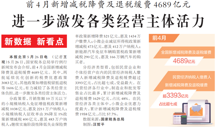 5月26日,国家税务总局举行例行新闻发布会介绍,前4月全国新增减税降费及退税缓费4689亿元。其中,两批延续优化创新的税费优惠政策3083亿元,其他政策如增值税留抵退税等1606亿元,有力减轻了各类经营主体负担,进一步激发各类经营主体活力。(今日《人民日报》1版)