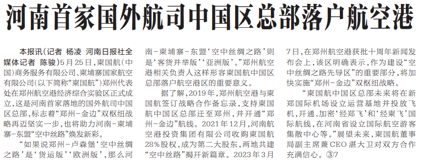 5月25日,柬国航(中国)商务服务有限公司、柬埔寨国家航空有限公司郑州代表处在郑州航空港经济综合实验区正式成立,这是河南首家落地的国外航司中国区总部,标志着“郑州-金边”双枢纽战略再迈坚实一步,也将助力河南-柬埔寨-东盟“空中丝路”焕发新彩。(今日《河南日报》1版)