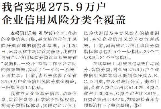 全面、准确的企业信息归集,是实施企业信用风险分类管理的前提和基础。5月26日,记者从省市场监管局获悉,我省打通省企业信用风险分类管理系统与省“双随机、一公开”监管工作平台之间的数据壁垒,实现了“一平台一系统”互通共享。目前,该系统实现了全省275.9万户企业信用风险分类全覆盖,已归集信息1.4亿条。(今日《河南日报》1版)