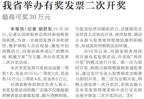 5月26日,记者从国家税务总局河南省税务局获悉,为进一步规范发票开具和使用,维护纳税人合法权益,激发市民消费活力,河南省税务局以“消费河南税惠万家”为主题,举办有奖发票二次开奖活动。(今日《河南日报》2版)