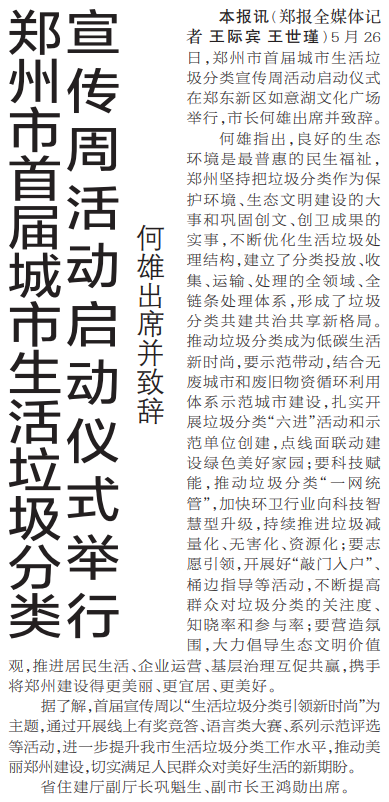 5月26日,郑州市首届城市生活垃圾分类宣传周活动启动仪式在郑东新区如意湖文化广场举行,市长何雄出席并致辞。(今日《郑州日报》1版)