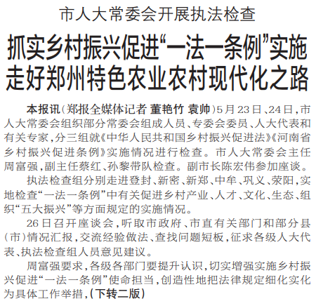 5月23日、24日,市人大常委会组织部分常委会组成人员、专委会委员、人大代表和有关专家,分三组就《中华人民共和国乡村振兴促进法》《河南省乡村振兴促进条例》实施情况进行检查。市人大常委会主任周富强,副主任蔡红、孙黎带队检查。副市长陈宏伟参加座谈。(今日《郑州日报》1版、2版)