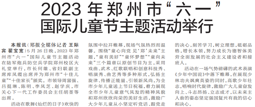 5月26日晚,2023年郑州市“六一”国际儿童节主题活动在陆军炮兵防空兵学院郑州校区大礼堂举行,市长何雄、省妇联副主席库凤霞出席并为郑州市“十佳儿童”“十佳家长”颁奖。市领导周富强、吕挺琳、陈明、李凤芝、赵学庆,市关心下一代工作委员会主任胡荃等出席。(今日《郑州日报》1版)