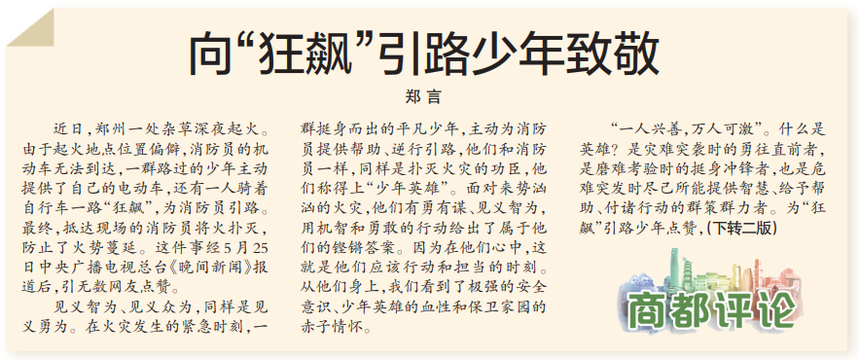 近日,郑州一处杂草深夜起火。由于起火地点位置偏僻,消防员的机动车无法到达,一群路过的少年主动提供了自己的电动车,还有一人骑着自行车一路“狂飙”,为消防员引路。最终,抵达现场的消防员将火扑灭,防止了火势蔓延。这件事经5月25日中央广播电视总台《晚间新闻》报道后,引无数网友点赞。(今日《郑州日报》1版、2版)