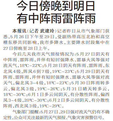 记者昨日从市气象部门获悉,5月26日下午至29日,受副热带高压北抬和高空槽东移共同影响,我市多降水,主要降水时段集中在27日傍晚至28日上午。(今日《郑州日报》1版)