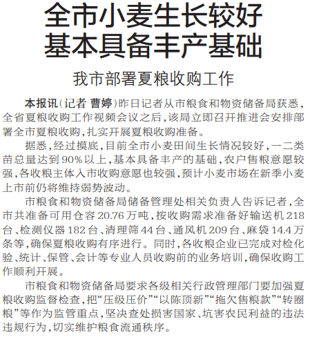 昨日记者从市粮食和物资储备局获悉,全省夏粮收购工作视频会议之后,该局立即召开推进会安排部署全市夏粮收购,扎实开展夏粮收购准备。(今日《郑州日报》1版)
