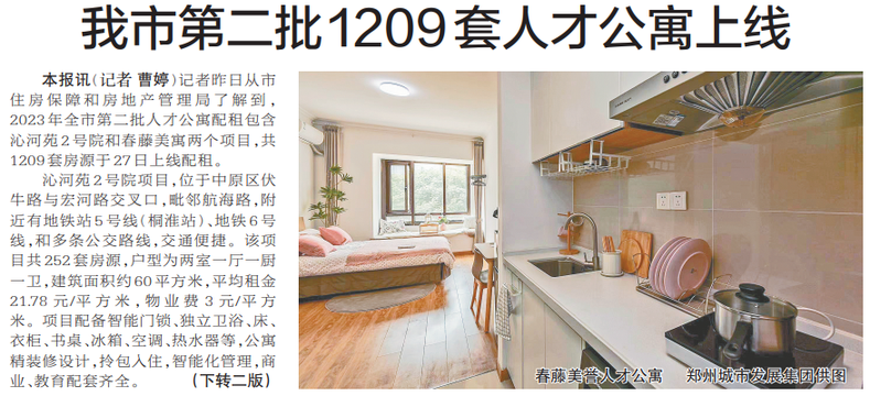 记者昨日从市住房保障和房地产管理局了解到,2023年全市第二批人才公寓配租包含沁河苑2号院和春藤美寓两个项目,共1209套房源于27日上线配租。(今日《郑州日报》1版、2版)