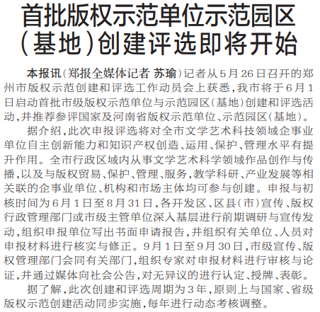记者从5月26日召开的郑州市版权示范创建和评选工作动员会上获悉,我市将于6月1日启动首批市级版权示范单位与示范园区(基地)创建和评选活动,并推荐参评国家及河南省版权示范单位、示范园区(基地)。(今日《郑州日报》2版)