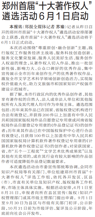 郑州首届“十大著作权人”遴选活动6月1日启动