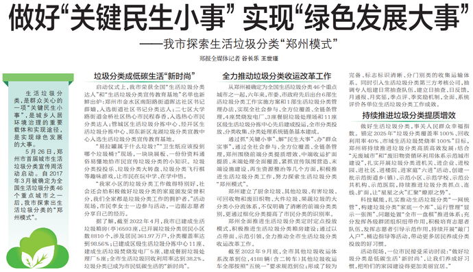 5月26日,郑州市首届城市生活垃圾分类宣传周活动启动。自2017年3月被确定为全国生活垃圾分类46个重点城市之一后,我市探索出生活垃圾分类的“郑州模式”。(今日《郑州日报》2版)