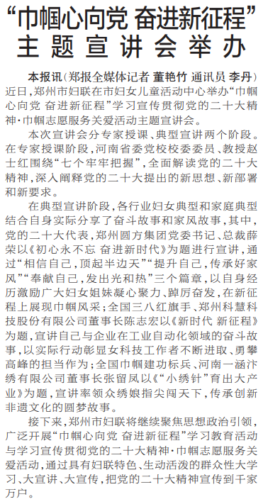 近日,郑州市妇联在市妇女儿童活动中心举办“巾帼心向党 奋进新征程”学习宣传贯彻党的二十大精神·巾帼志愿服务关爱活动主题宣讲会。(今日《郑州日报》2版)