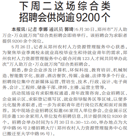 5月30日,郑州市“万人助万企·万众就万岗”综合类招聘会即将举行。该招聘会为求职者提供9200余个岗位。(今日《郑州日报》2版)