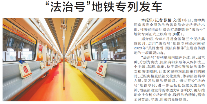 昨日,由中共河南省委全面依法治省委员会守法普法小组、河南省司法厅联合打造的郑州“法治号”地铁专列正式上线启动。(今日《郑州日报》2版)