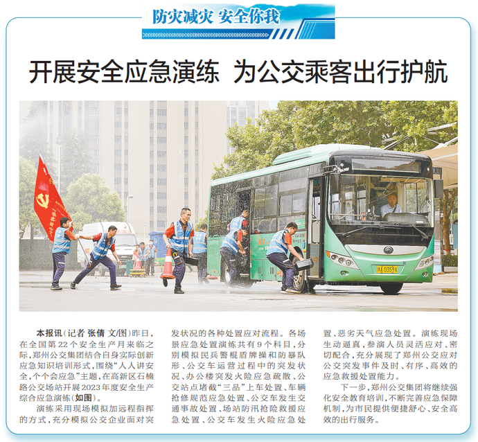 昨日,在全国第22个安全生产月来临之际,郑州公交集团结合自身实际创新应急知识培训形式,围绕“人人讲安全,个个会应急”主题,在高新区石楠路公交场站开展2023年度安全生产综合应急演练。(今日《郑州日报》2版)