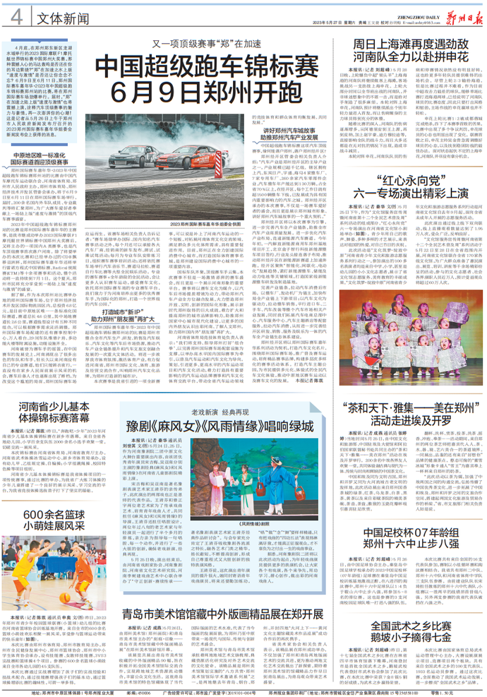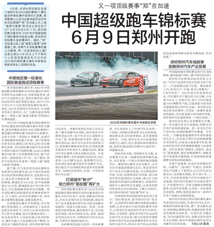 4月底,在郑州郑东新区龙湖水域举行的2023国际摩联F1摩托艇世界锦标赛中国郑州大奖赛,那种震撼人心的马达轰鸣是否还在你的耳边萦绕?“郑”在加速之水上版“速度与激情”是否还让你念念不忘?6月9日至6月11日,郑州国际赛车嘉年华·2023年中国超级跑车锦标赛郑州站的比赛,将在郑州国际赛车场劲爆举行。届时,“郑”在加速之陆上版“速度与激情”也将震撼上演,诠释汽车顶级赛事的魅力与豪情,再一次澎湃你的心潮!这是记者从5月26日上午于郑州市人民政府新闻发布厅召开的2023郑州国际赛车嘉年华组委会新闻发布会上获得的消息。(今日《郑州日报》4版)