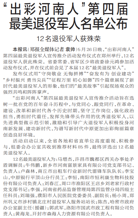 5月26日晚,“出彩河南人”第四届最美退役军人宣传推介活动发布仪式在郑州举行,12名退役军人获此殊荣。省委常委、省军区少将政委徐元鸿参加活动发布仪式,并在仪式前会见了本届12名“最美退役军人”。(今日《郑州日报》1版)