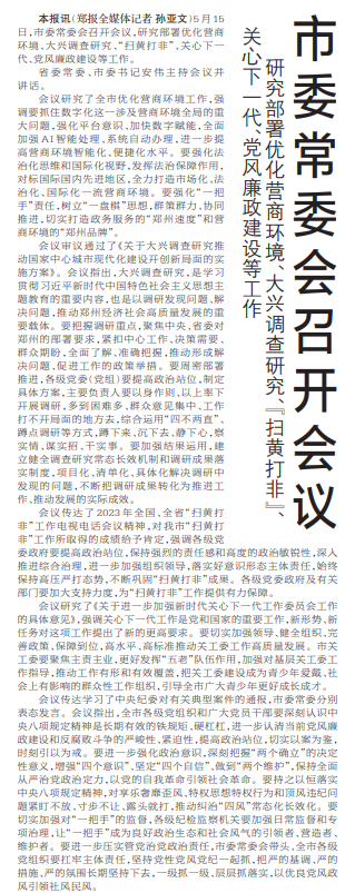 5月15日,市委常委会召开会议,研究部署优化营商环境、大兴调查研究、“扫黄打非”、关心下一代、党风廉政建设等工作。