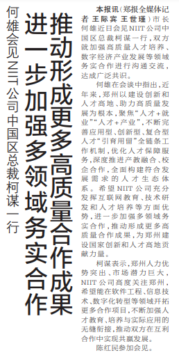 市长何雄近日会见NIIT公司中国区总裁柯谋一行,双方就加强高质量人才培养、数字经济产业发展等领域务实合作进行沟通交流,达成广泛共识。