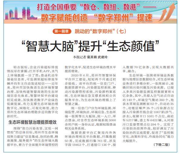 轻击鼠标,企业污染超标排放情况尽在掌握;打开手机APP,水气土环境数据一目了然;登录机动车基础信息库,可监测到超标排放车辆并向车主自动发送短信……近年来,郑州市加快推进生态环境智慧治理、加快构建智慧高效的生态环境信息化体系,智慧环保平台建设初见成效,加快推进数字产业绿色低碳发展,有力支撑生态环境治理数字化、网络化、可视化转型,助力郑州生态环境治理稳步迈向数字化新时代。(今日《郑州日报》1版、2版)