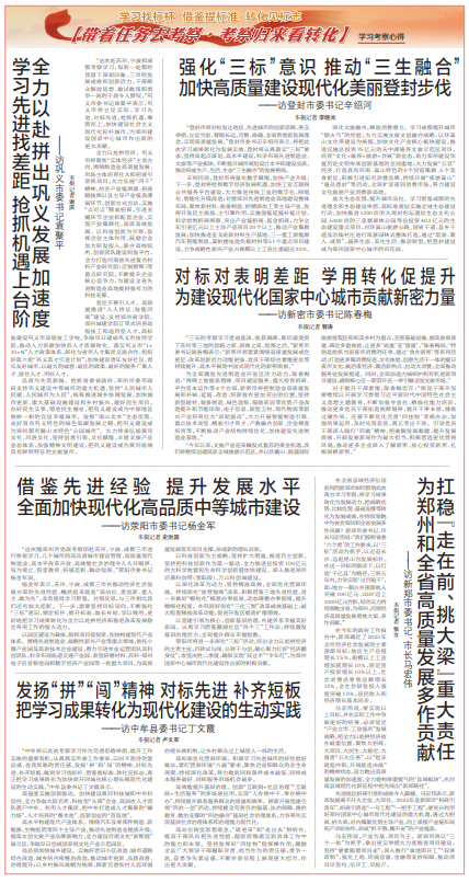 “中牟将以此次考察学习作为完善思路举措、提升工作实效的重要契机,认真落实市委工作要求,以时不我待的紧迫感、舍我其谁的责任感,发扬‘拼’和‘闯’的精神,对标先进、补齐短板,做到学习找标杆、借鉴提标准、转化见标志,真正把学习成果转化为加快郑开同城化核心增长极现代化建设的生动实践。”中牟县委书记丁文霞表示。(今日《郑州日报》2版)