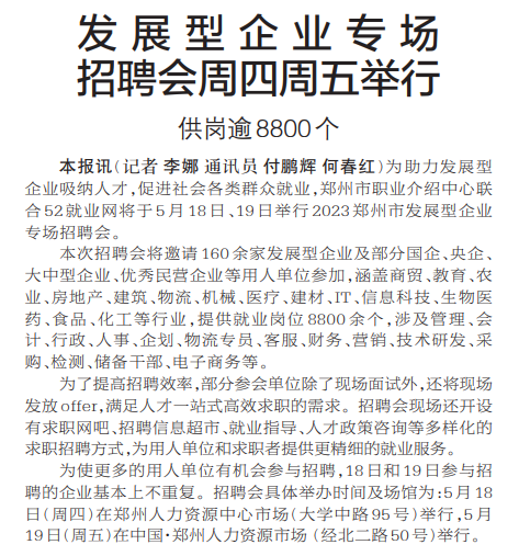 为助力发展型企业吸纳人才,促进社会各类群众就业,郑州市职业介绍中心联合52就业网将于5月18日、19日举行2023郑州市发展型企业专场招聘会。(今日《郑州日报》2版)