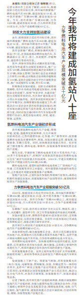 昨日,记者从郑州市工信局了解到,2023年,根据国家示范应用目标任务,郑州城市群要推广燃料电池汽车855辆、建设加氢站19座,其中我市要推广车辆690辆、建设加氢站12座。今年,我市将推广车辆800辆、力争1000辆,建成加氢站80座,引入和培育企业10家左右,力争产业规模突破50亿元。(今日《郑州日报》5版)
