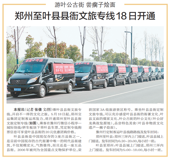 乘叶县县衙文旅专线,开启不一样的文化之旅。5月18日起,郑州交运集团定制客运再发力,将开通郑州至叶县县衙文旅定制专线,乘客在豫州行微信小程序—城际快线/拼车板块下单叶县车票,凭定制专线购票信息可享受叶县县衙的20元优惠团购价格。(今日《郑州日报》5版)