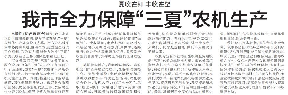 目前,我市小麦正处于成熟关键期,夏粮丰收在望,“三夏”农机化生产即将拉开大幕。市农业机械技术中心提前谋划、主动作为,建立健全各项工作机制,采取有力措施全力做好“三夏”小麦机收准备工作,确保夏粮颗粒归仓。(今日《郑州日报》6版)