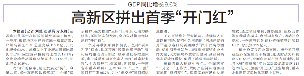 记者昨日从郑州高新区创新发展局了解到,一季度,根据地区生产总值统一核算结果,郑州高新区GDP总量完成152.0亿元,同比增长9.6%。规模以上工业增加值同比增长11.7%;固定资产投资同比增长18.1%;全社会消费品零售总额完成53.1亿元,同比增长10.9%。(今日《郑州日报》6版)
