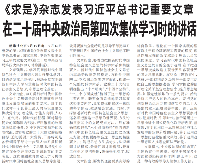 5月16日出版的第10期《求是》杂志将发表中共中央总书记、国家主席、中央军委主席习近平的重要文章《在二十届中央政治局第四次集体学习时的讲话》。(今日《人民日报》1版)
