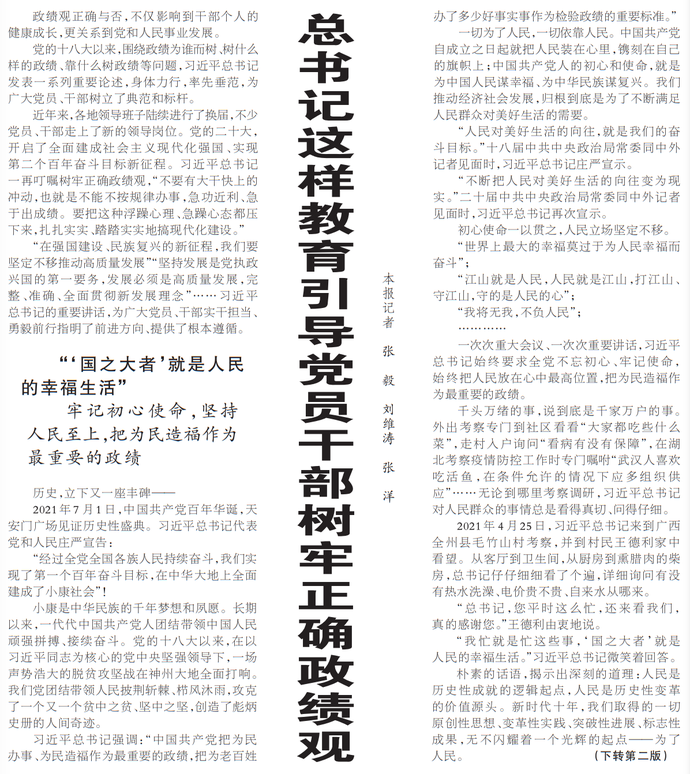 政绩观正确与否,不仅影响到干部个人的健康成长,更关系到党和人民事业发展。(今日《人民日报》1版、2版)