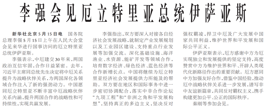 国务院总理李强5月15日上午在人民大会堂会见来华进行国事访问的厄立特里亚总统伊萨亚斯。(今日《人民日报》1版)