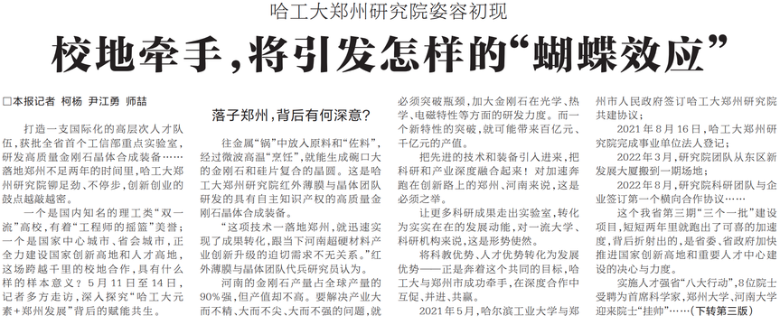 打造一支国际化的高层次人才队伍,获批全省首个工信部重点实验室,研发高质量金刚石晶体合成装备……落地郑州不足两年的时间里,哈工大郑州研究院铆足劲、不停步,创新创业的鼓点越敲越密。(今日《河南日报》1版、3版)