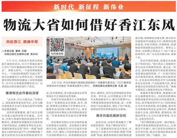 作为河南省代表团赴港招商的一项重要专题活动,5月15日,“2023豫港国际物流合作对接会”在香港会展中心举行。本次对接会以“豫见香港携手共赢”为主题,共谋物流合作高质量发展,共促物流建设新格局,对深化河南与香港经贸交流、拓展两地国际物流领域合作具有重要意义。(今日《河南日报》1版)