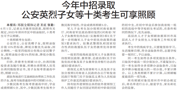 6月1日,记者从市教育局获悉,按照有关规定,2023年郑州市区中招录取时,十类考生可予以照顾。(今日《郑州日报》2版)