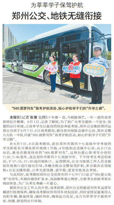 十年磨一剑,今朝露锋芒,一年一度的高考即将拉开帷幕。6月1日,记者了解到,为了给广大考生提供一个安全、快捷的出行环境,让高考学生以最佳的状态奔赴考场,郑州公交集团第四运营公司将于6月7日、8日高考期间,联合郑州地铁会展中心站、郑州交警六大队一中队开展“985圆梦列车”高考护航活动,贴心护航学子们的“升学之路”。(今日《郑州日报》4版)