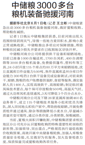 中储粮紧急出动3000多台粮机装备驰援河南,做好夏粮收购,帮助粮农减损。