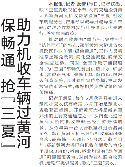 昨日,记者获悉,眼下正值麦收农忙季节,河南交通投资集团郑新黄河大桥收费站设置“三夏”机收车辆服务台,安排专职疏导员疏导指挥车辆,对联合收割机实行优先查验、优先放行,落实惠民政策。(今日《郑州日报》7版)