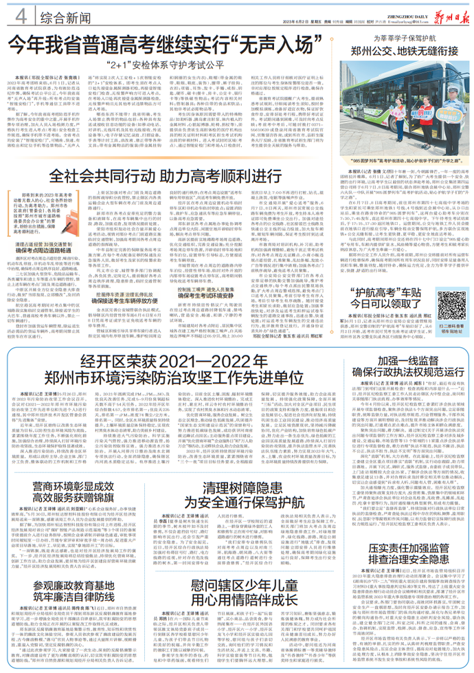 即将到来的2023年高考牵动着无数人的心,社会各界纷纷行动,为高考助力。郑州市各区政府(管委会)、各局委按照“郑州市城市道路畅通委员会办公室”的要求,纷纷出台措施,保障高考顺利进行。(今日《郑州日报》4版)