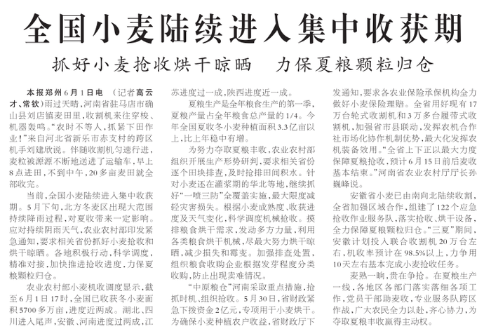 截至6月1日18时已收获小麦32万余亩
