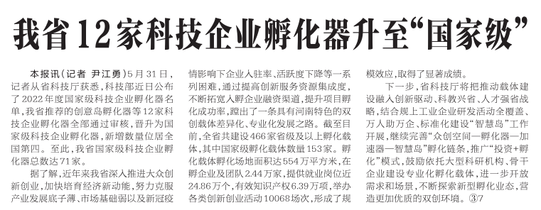 5月31日,记者从省科技厅获悉,科技部近日公布了2022年度国家级科技企业孵化器名单,我省推荐的创意岛孵化器等12家科技企业孵化器全部通过审核,晋升为国家级科技企业孵化器,新增数量位居全国第四。至此,我省国家级科技企业孵化器总数达71家。(今日《河南日报》1版)