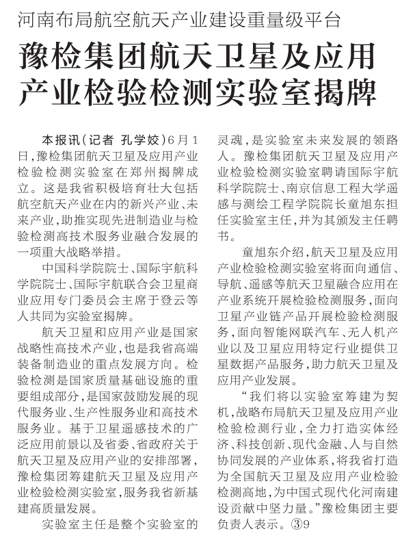 6月1日,豫检集团航天卫星及应用产业检验检测实验室在郑州揭牌成立。这是我省积极培育壮大包括航空航天产业在内的新兴产业、未来产业,助推实现先进制造业与检验检测高技术服务业融合发展的一项重大战略举措。(今日《河南日报》1版)