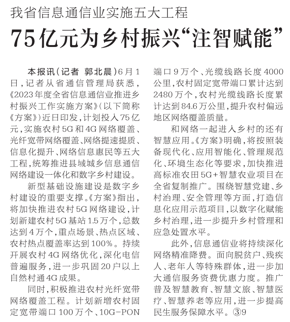 6月1日,记者从省通信管理局获悉,《2023年度全省信息通信业推进乡村振兴工作实施方案》近日印发,计划投入75亿元,实施农村5G和4G网络覆盖、光纤宽带网络覆盖、网络提速提质、信息化提升、网络信息惠民等五大工程,统筹推进县域城乡信息通信网络建设一体化和数字乡村建设。(今日《河南日报》1版)