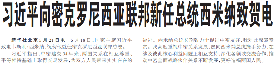 5月18日,国家主席习近平致电韦斯利·西米纳,祝贺他就任密克罗尼西亚联邦总统。(今日《人民日报》1版)