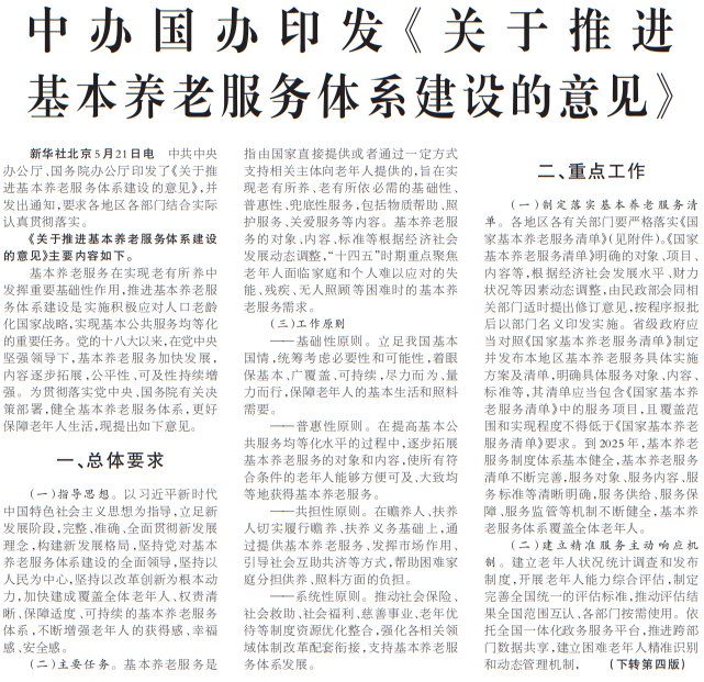 中共中央办公厅、国务院办公厅印发了《关于推进基本养老服务体系建设的意见》,并发出通知,要求各地区各部门结合实际认真贯彻落实。(今日《人民日报》1版、4版)
