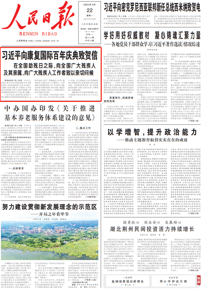 5月21日,国家主席习近平向康复国际百年庆典致贺信,并在全国助残日之际,向全国广大残疾人及其亲属,向广大残疾人工作者致以亲切问候,向关心支持中国残疾人事业的国际组织和各方人士表示衷心感谢。(今日《人民日报》1版)