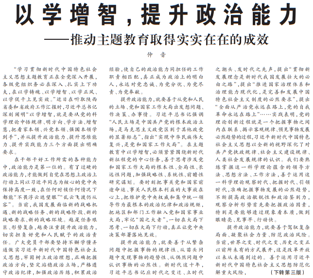 “学习贯彻新时代中国特色社会主义思想主题教育正在全党深入开展,各级党组织务必在深入、扎实上下功夫,在以学铸魂、以学增智、以学正风、以学促干上见实效。”近日在听取陕西省委和省政府工作汇报时,习近平总书记深刻阐明“以学增智,就是要从党的科学理论中悟规律、明方向、学方法、增智慧,把看家本领、兴党本领、强国本领学到手”,并从提升政治能力、提升思维能力、提升实践能力三个方面提出明确要求。(今日《人民日报》1版、3版)