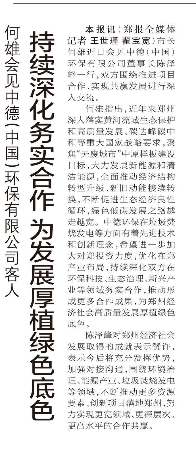 何雄指出,近年来郑州深入落实黄河流域生态保护和高质量发展、碳达峰碳中和等重大国家战略要求,聚焦“无废城市”中原样板建设目标,大力发展新能源和清洁能源,全面推动经济结构转型升级、新旧动能接续转换,不断促进生态经济良性循环,绿色低碳发展之路越走越宽。中德环保在垃圾焚烧发电等方面有着先进技术和创新理念,希望进一步加大对郑投资力度,优化在郑产业布局,持续深化双方在环保科技、生态治理、新兴产业等领域务实合作,推动形成更多合作成果,为郑州经济社会高质量发展厚植绿色底色。(今日《郑州日报》1版)